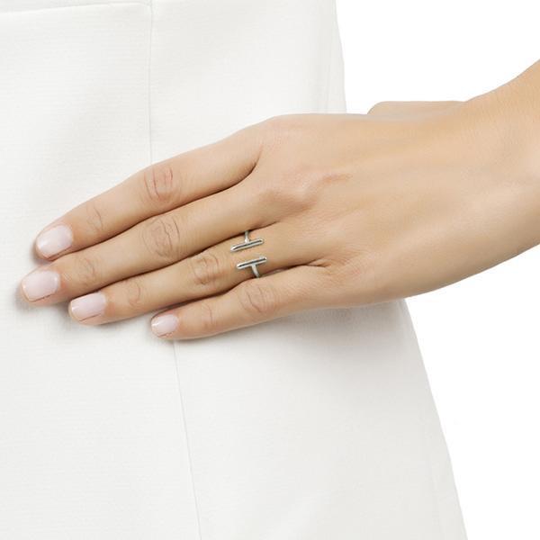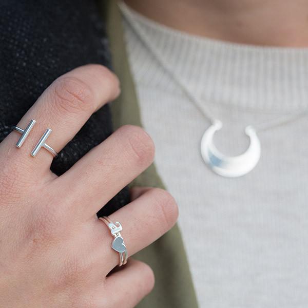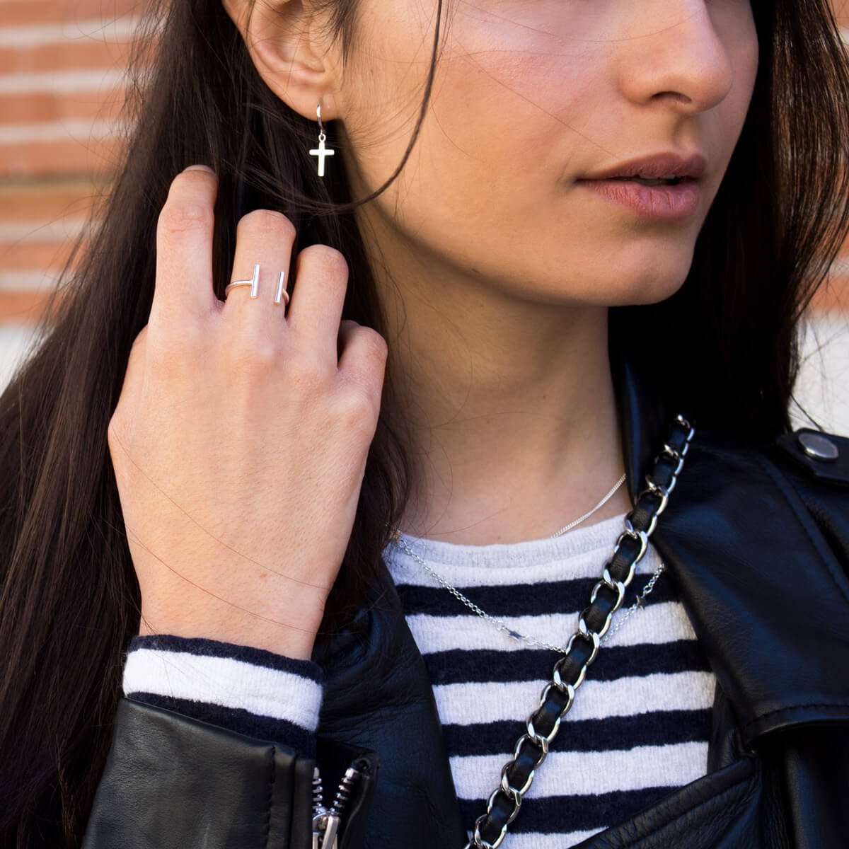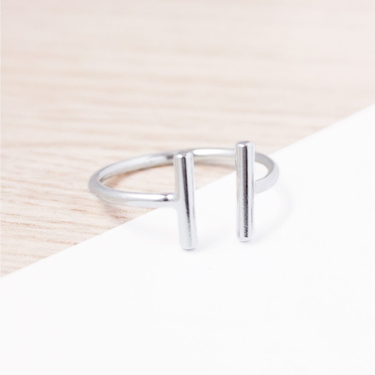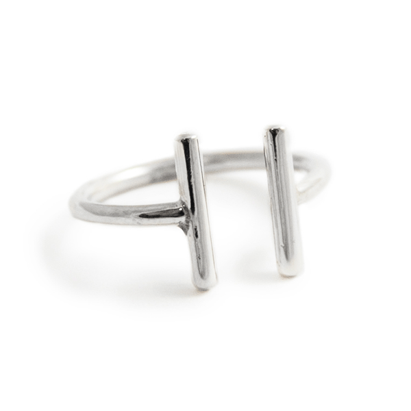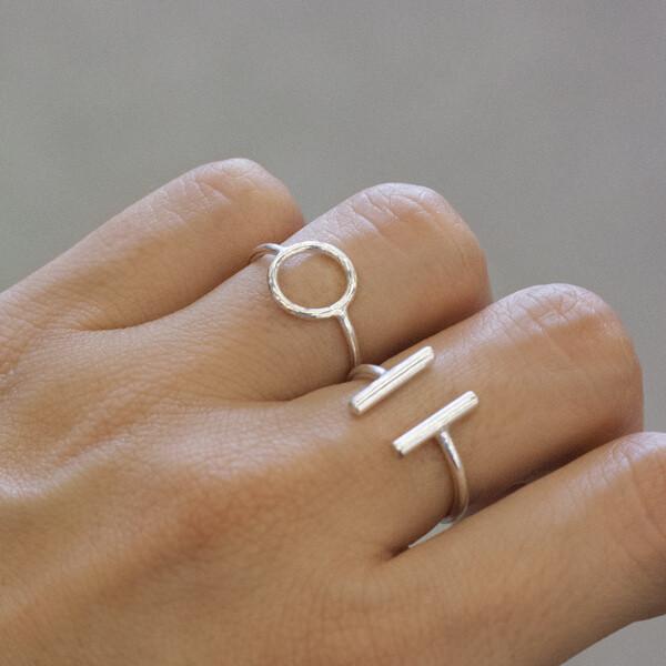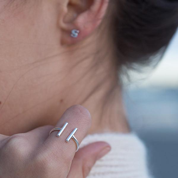 Geométrico y sobrio, una joya que te gustará mas cada día. Anillo de Plata de Ley con sección de 1,5mm, obertura central y dos varillas de 11x2mm. Ajústalo a tu medida para que forme parte de todos tus looks.