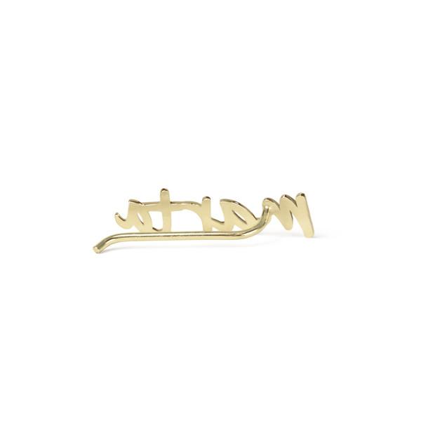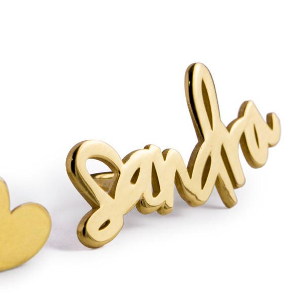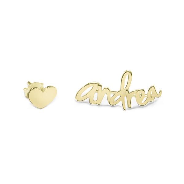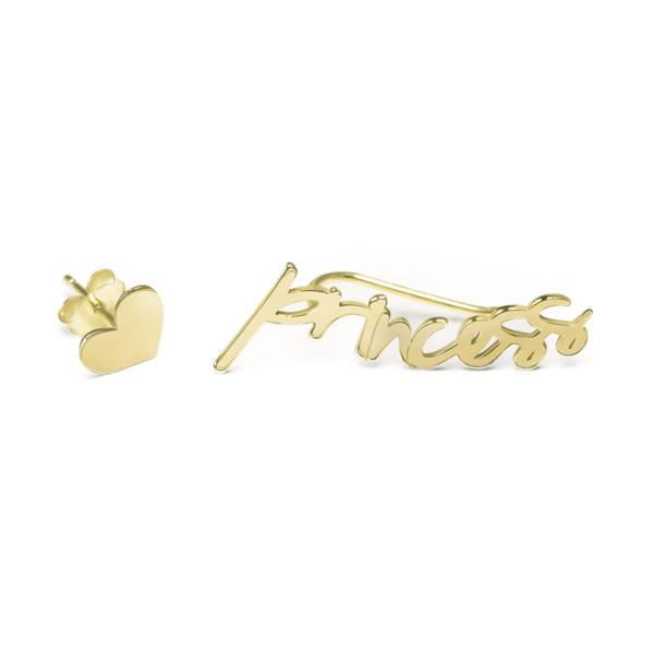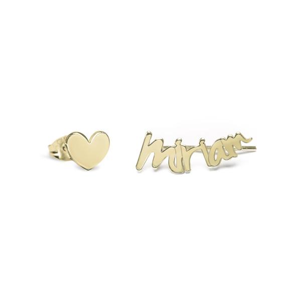 Elegantes pendientes estilo ear crawler formados por el nombre que tú elijas en la oreja izquierda y un corazón para la derecha, todo en Plata de Ley cubierta por un baño de Oro Amarillo 18K y 1 micra. Todas las letras son minúsculas para mantener la forma estilizada del pendiente.